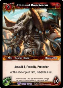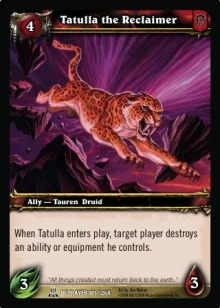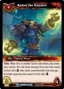 One thing I started to notice in looking at allies with healing powers was that a lot of them deal nature damage. Of course, since we’re a Hunter/Druid combo that immediately brings to mind Aspect of the Wild and Earth and Moon. It didn’t take much digging to fill up a good stable of Nature dudes. Another notable trend I saw was the increasing number of Taurens I kept putting in the deck. I even have a Tribe trigger in Magatha Grimtotem. Kahul the Sunseer became a shoo-in to go with the rest of the herd. Imagine resolving Toshe Chaosrender after Kahul. The stuff of dreams (or nightmares)!
